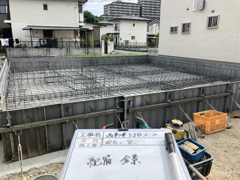 建物の配置、基礎の配筋、基礎の厚さ、基礎の高さ等が設計図面の通りできているか確認します。